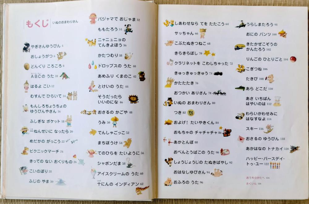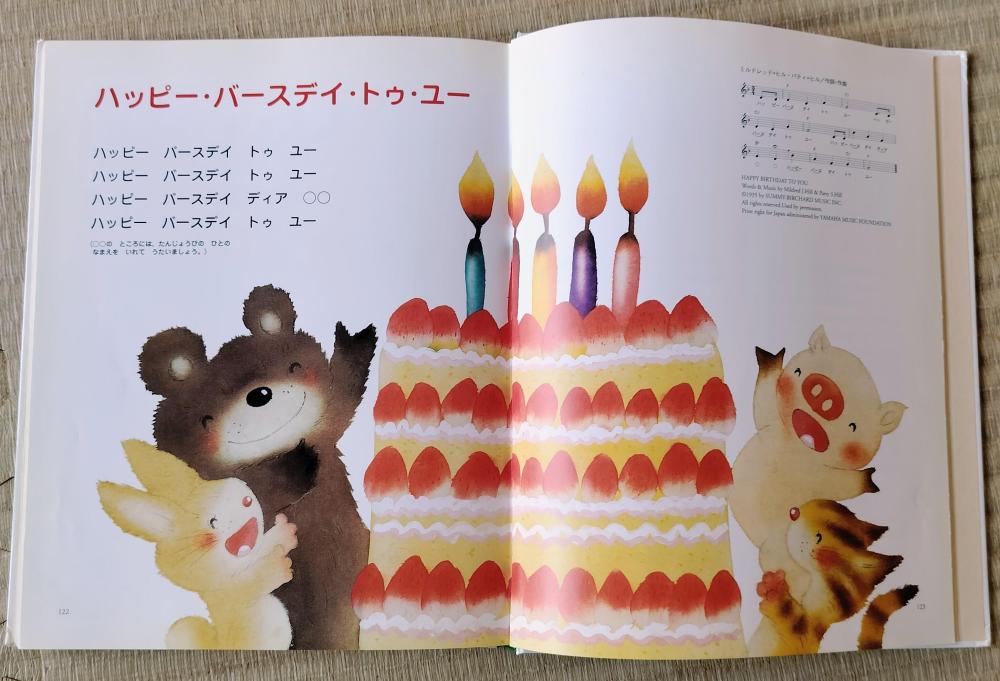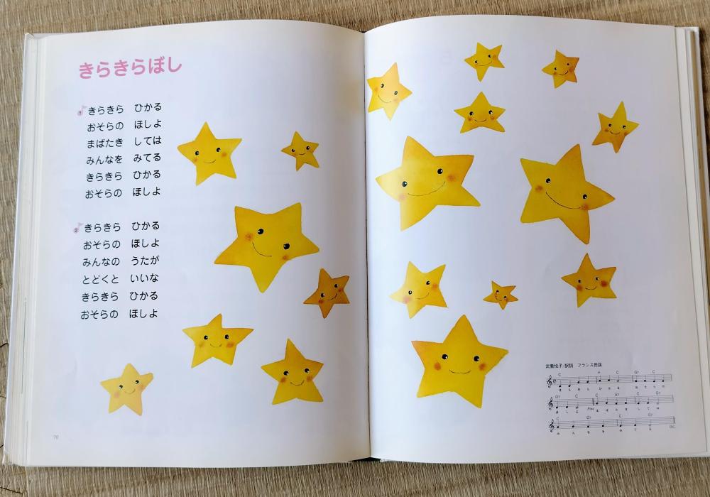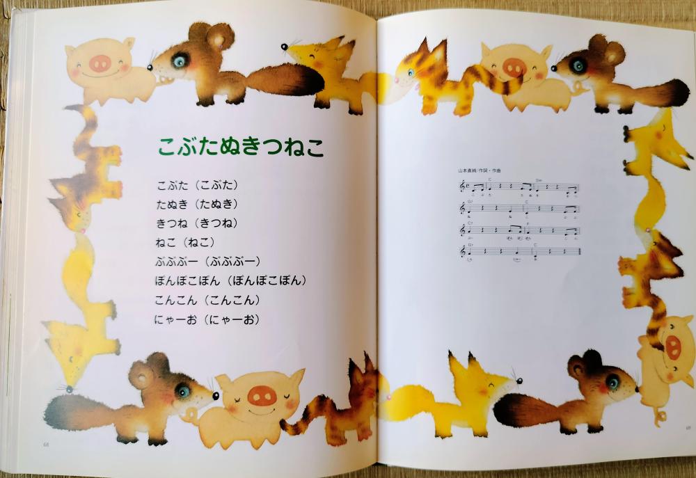 「いぬのおまわりさん」や「きらきらぼし」など、全60曲の歌詞と楽譜を掲載。可愛らしいイラストが全ページに広がり、見ているだけでも心がほっとする内容です。